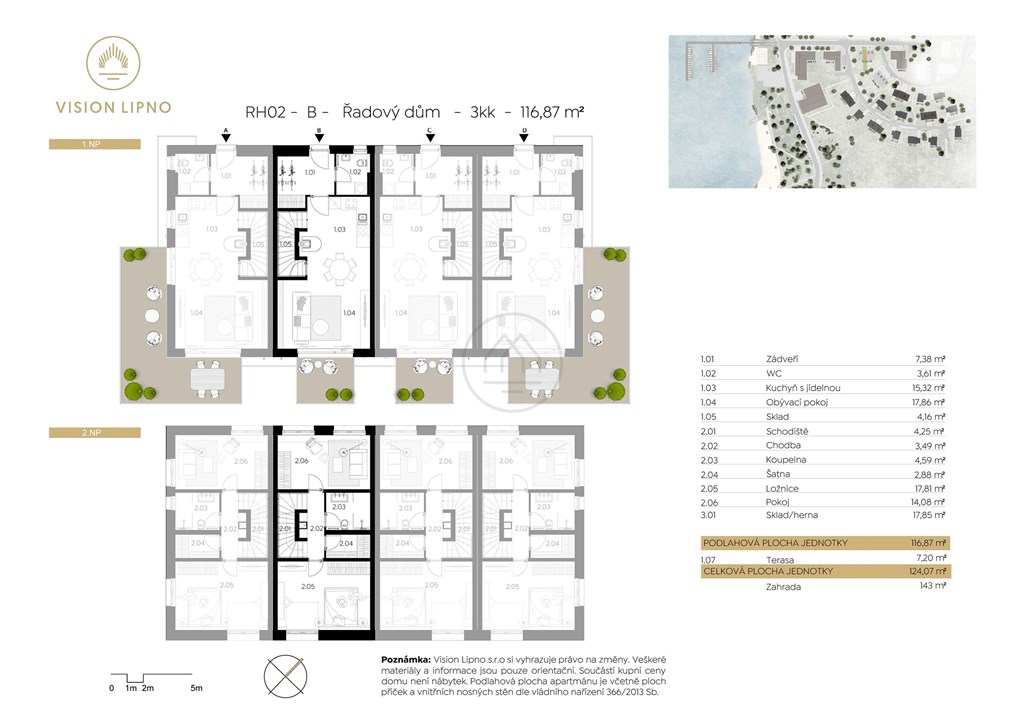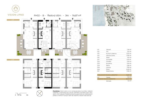 Představujeme řadový dům s terasou a zahradou, který je součástí prémiového resortu VISION LIPNO, přímo u břehu Lipna. Jednotka o dispozici 3+kk s podlahovou plochou 117 m2 je součástí řadového domu a nabízí moderní zázemí k rekreaci pro Vaši rodinu i budoucí hosty. Přízemí vítá prostorným zádveřím a samostatným WC. Následuje velký obývací pokoj s kuchyní, jídelnou a vstupem na krásnou terasu a zahradu s výhledem na vodní hladinu Lipna. V podkroví se nachází dva pokoje, koupelna a v dalším podlaží skladovací prostory. VYBAVENÍ Cena je včetně 21% DPH a zahrnuje dodávku nadstandartních zařizovacích předmětů LAUFEN, velkoformátových dlažeb 120 x 60 cm a obkladů. Součástí jsou kvalitní vinylové podlahy, interiérové dveře a zárubně PRÜM. Dům je vybaven Smarthome technologií s napojením na centrální systém, ze kterého lze dálkově kontrolovat přístup a zabezpečení objektu, včetně optimalizace vytápění elektrokotlem a osvětlení. Na přání klienta lze zajistit kompletní interiérové zařízení - nábytek, spotřebiče i dekorace, vše ve vysokém standardu a sladěné s designem resortu. Vizualizace jsou pouze ilustrativní. Pro přesný popis stavebních standardů a vybavenosti nás prosím kontaktujte. RESORT VISION LIPNO Jedná se o výjimečný a atraktivní resort, který cílí na všechny skupiny a má potenciál být nejlepším místem pro trávení volného času na Lipně. K dispozici bude recepce, beach bar a další služby. V areálu je také písčitá přírodní pláž, přístaviště pro 39 lodí, dětské hřiště a místa pro další aktivity jako pétanque, disk golf aj. Připraven je také rental a facility managment, který se stará o správu a údržbu resortu, odklízení sněhu, sekání trávy aj. Na prodej jsou i další pozemky, apartmány a řadové domy. LOKALITA Poloha Kovářského poloostrova s výhledem na největší vodní plochu ČR v srdci Šumavy láká v každém ročním období. Na jaře a na podzim na turistiku, výlety do přírody, či cyklistiku. V létě pak vítá zejména milovníky vodních sportů - plavání, jachting, surfing, kiting, či sportovní rybolov. V zimě pak nabízí téměř 12 km sjezdových tratí, lyžařskou a snowboardovou školu, známý snowpark, běžecké tratě a dětské lyžařské hřiště. Pořiďte si nemovitost v soukromé top lokalitě u vody v krásné přírodě, v podobě investice s pravidelným výnosem a dlouhodobým zhodnocením. Exkluzivně nabízíme celoroční údržbu a správu pronájmu nové nemovitosti v období Vaší nepřítomnosti. • Výjimečný řadový dům s výhledem na vodu • Prostorná terasa s předzahrádkou • Luxusní zařízení a Smarthome technologie • Možnost vlastního kotviště pro loď • All in one služby resortu, včetně správy pronájmu Kontaktujte specialistu na investice v lipenské lokalitě pro více informací, popřípadě se zastavte na nezávaznou prohlídku.