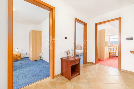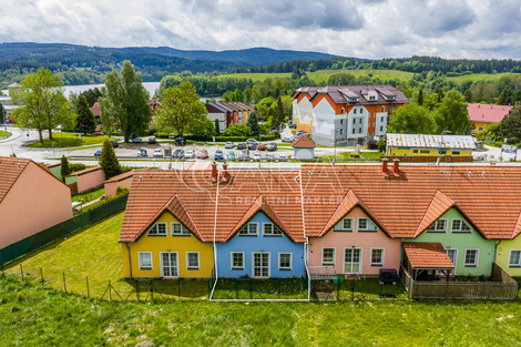 Dobrý den, jsem velmi ráda, že vám mohu představit tento prostorný a přesto útulný řadový dům 5+kk se zastřešenou terasou, přístřeškem na auto a zahradním zděným domkem, který se nachází v malebném městysi Frymburk ležícím na pobřeží známé vodní nádrže Lipno, na praktické adrese jak pro rodinné bydlení, tak i pro rekreační pobyty či podnikatelské účely. Lokalita, ve které se nemovitost nachází, je ideální jak k trvalému bydlení, tak i k účelům rekreace a pronájmů, a tedy poskytuje dostupnost k veškeré občanské vybavenosti i sportovním aktivitám všech různých druhů. Kromě sportovního a zážitkového vyžití si zde najdete i místa pro relax, ať už ve wellnessu hotel Frymburk, nebo v krásné přírodě v okolí Lipna. V případě potřeby jste ve větším městě, jako je Český Krumlov, za 30 minut jízdy. Nacházíme se také kousek od rakouských hranic, kdy nemovitost může být ideální pro pendlery, kteří hledají skvělou kombinaci vlastního bydlení v ČR a zároveň příjemnou dojezdovou vzdálenost do vašeho zaměstnání. Dům jako takový poskytne užitnou plochu o necelých 120 m2 a je součástí řadového rodinného bloku, poskytne 5 obytných pokojů, dvě koupelny, prostorný obývací pokoj s kuchyní a jídelnou, technické komory a spíž. Vzdušný obývací pokoj vám skvěle doplní přímý vstup na zastřešenou terasu o výměře 14,5 m2, ideální pro posezení a grilování. Naopak na druhé straně domu budete mít z kuchyně vstup na menší zahradu za domem, kde budete mít ideální klidné prostředí na váš relax, na opalování nebo odpočinek třeba na houpačce. Jako poslední k praktičnosti domu napomůže vlastní přístřešek na auta a zahradní domek/skladovací místnost skvělá na uložení vašeho sportovního vybavení a nebo zahradní techniky. Pro další parkování je možné přikoupit ještě jedno vyhrazené parkovací stání před domem. Přízemí domu je vytápěno podlahovým topení a v obývacím pokoji je možné napojit na komín kamna na tuhá paliva pro útulnou atmosféru a pro přitopení. Stávající majitel využíval stavbu převážně k účelům krátkodobých pronájmů, kdy objekt poskytl hostům 8 až 10 míst na spaní. Hosté ocenily plně vybavené prostory nemovitosti, koupelnu na každém patře, skladovací místnost pro úschovu jejich kol nebo lyží, a hlavně terasu a zahrádku, kde si v klidu mohli po náročném aktivním dni posedět a odpočinout. V době covidové se nemovitost pronajímala dlouhodobě za fixní měsíční nájemné a bylo tomu tak do nedávna. Dům je plně připraven pro vaše potřeby a neváznou na něm žádná věcná břemena, či věcná omezení, která by bránila v užívání tohoto domu. Součástí prodeje může být veškerý nábytek a el. vybavení nacházející se na fotografiích. Interiéry nemovitosti nebude také těžké modernizovat a přizpůsobit si je vlastním představám. Tak pokud vás vše zaujalo a rádi byste se dozvěděli více informací, určitě se mi ozvěte a já vám zašlu kompletní prezentaci včetně technických parametrů. Mějte se hezky a těším se na slyšenou a na viděnou na prohlídce, Anika Bártlová, Bartlgroup.