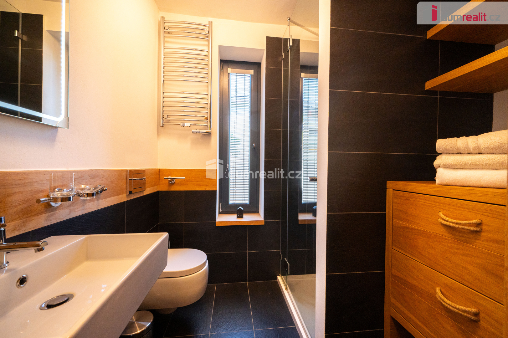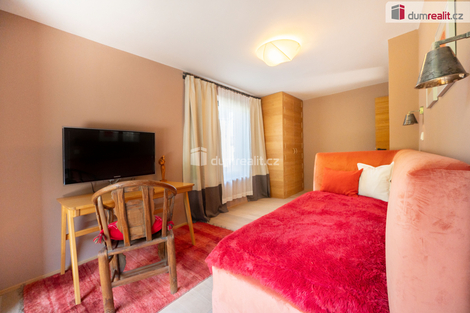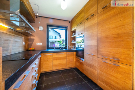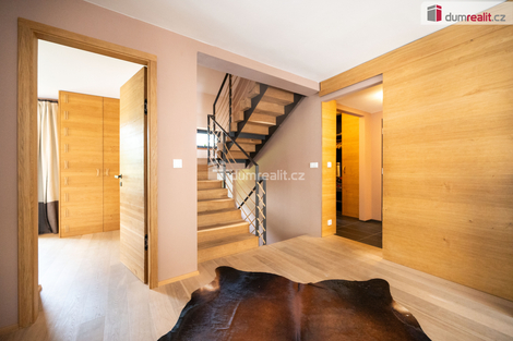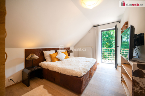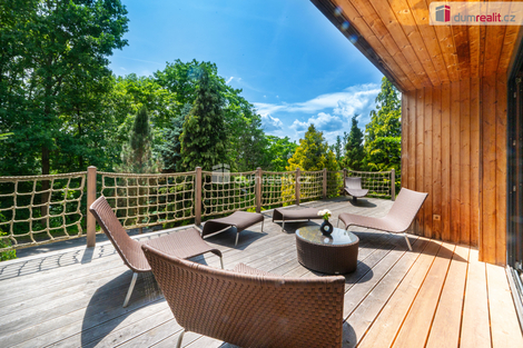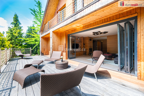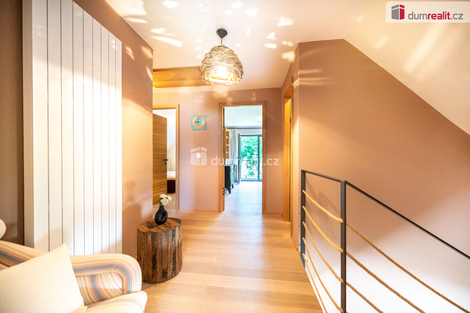 Dumrealit.cz Vám zprostředkuje koupi kompletně zrekonstruovaného reprezentativního sídla - designového, prakticky řešeného třípodlažního zatepleného rodinného domu 5+kk se třemi koupelnami, terasou, balkónem, dvěma garážemi, tělocvičnou, zahradním domkem a kaskádovitým oploceným pozemkem ve městě Netolice, Na Horánku 666. Dům v suterénu nabízí dvojgaráž s elektronabíječkou na automobil, pokoj pro hosty, tech. místnost s tělocvičnou, koupelnu se saunou, masážní sprchou a toaletu. V 1. patře se nachází prostorný obývací pokoj propojený s jídelním koutem a kuchyní. Dále je zde pracovna, koupelna a toaleta. Z každé obytné místnosti na patře se dá vstoupit na slunnou terasu s krbem. Z obývacího pokoje lze celé francouzské okno složit a tím propojit prostor s terasou. Na každém podlaží je koupelna a toaleta. V obytném podkroví se nachází tři ložnice se vstupem na balkón, koupelna s vanou, sprchovým koutem a samostatná toaleta. Dům je propojen schodištěm s nášlapy z masivu na ocelové konstrukci se zábradlím s lanovou výplní. Podrobné rozkreslení jednotlivých podlaží naleznete na orientačních pláncích mezi fotografiemi. Celkový design je promyšlený, s čímž souvisí použité materiály, jednotná dřevina - dub - probíhá celým domem a je z ní např. obývací posuvná stěna, která rozděluje obývací pokoj s jídelnou, zárubně, dveřní křídla se skrytými panty, kuchyňská linka a vestavěné skříně s policemi. Rekonstrukce domu proběhla v roce 2011 a od té doby byl užíván pouze rekreačně. Dům je stále vytápěný a udržovaný úklidovou službou. Tech. náležitosti domu: dům je zateplený se skrytými dešťovými svody ve fasádě. Okna a vchodové dveře jsou dřevěné s povrchovou úpravou - antracit, s izolačními dvojskly. Objekt je připojen na elektřinu, veřejný vodovod a městskou kanalizaci. Vytápění a ohřev vody je elektrickým kotlem. Doporučuji prohlídku, dům si Vás získá a je připraven k okamžitému nastěhování. Zajistíme Vám financování a veškerý právní servis. Více informací Vám poskytne realitní makléř Tomáš Pelda z realitní kanceláře A TEMPO fungující pod ochrannou známkou dumrealit.cz. Ev. číslo: 651583. Energetický štítek: G