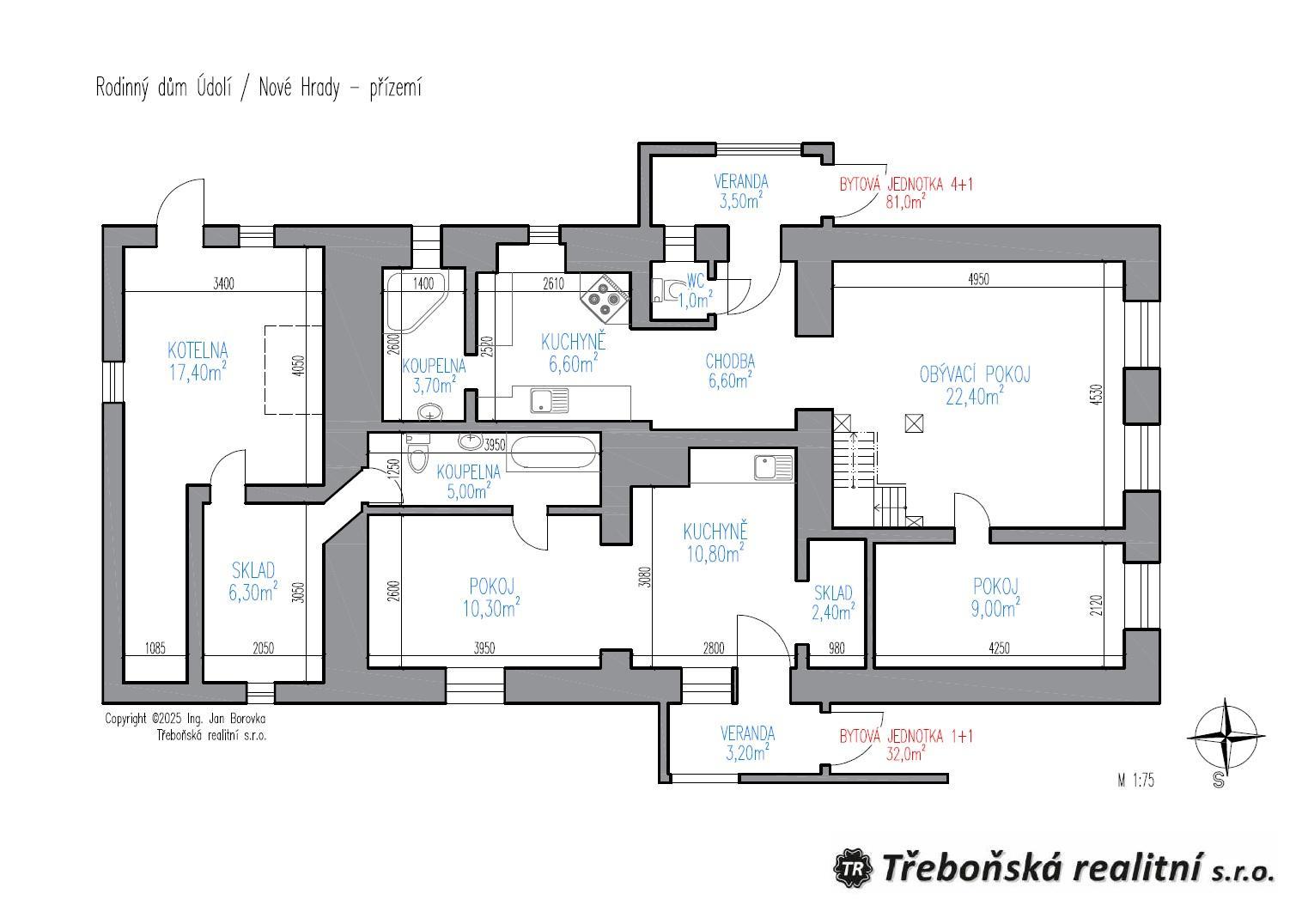 Ve výhradním zastoupení majitele nabízíme k prodeji rodinný dům v malebné místní části Údolí města Nové Hrady, která se nachází v Novohradském podhůří poblíž hranic s Rakouskem, přibližně třicet kilometrů jihovýchodně od Českých Budějovic a dvacet kilometrů jižně od Třeboně. Velkým benefitem této lokality je její poloha přímo u vstupu do známého přírodně-krajinářského parku Tereziino (Terčino) údolí, jednoho z nejkrásnějších míst v celém regionu. Prodávaný rodinný dům je rozdělen na dvě samostatné bytové jednotky, což umožňuje jeho využití jak pro dvougenerační bydlení, tak i pro kombinaci trvalého bydlení s pronájmem. Hlavní bytová jednotka o dispozici 4+1 a velikosti 81 m má vstup z jižní strany domu. Vstupní veranda vede do chodby, ze které se vchází do obývacího pokoje, kuchyně a koupelny. Z obývacího pokoje je vstup do samostatného pokoje a dále do podkroví, kde se nacházejí dva další pokoje. Druhá bytová jednotka o dispozici 1+1 a velikosti 32 m má samostatný vstup ze severní strany. Tvoří ji veranda, kuchyně propojená s obývacím pokojem a koupelna. Součástí domu je také kotelna se skladem, prostorná garáž (26 m) a udržovaná zahrada o výměře 1 335 m, která nabízí dostatek prostoru pro odpočinek i drobné hospodaření. Dům je napojen na elektřinu 230/400 V, vodovod je přiveden na hranici pozemku, aktuálně je využívána vlastní studna. Odpad je do septiku. Vytápění je řešeno kotlem na tuhá paliva. Nemovitost je vhodná jak pro trvalé rodinné bydlení, tak pro rekreační využití v klidném prostředí s výbornou dostupností do města i přírody. Energetická třída G je uvedena dočasně, vzhledem k novele zákona č. 406/2000 Sb. o hospodaření s energií. Po dodání energetického štítku bude uvedena skutečná energetická třída této nemovitosti. V případě více zájemců bude upřednostněn zájemce s nejvyšší nabídkou. Prohlídku této nemovitosti si můžete domluvit na níže uvedených kontaktech. Financování nemovitosti hypotečním úvěrem Vám případně rádi zajistíme. Třeboňská realitní s.r.o. PRODÁVÁME REALITY. REÁLNĚ. <a href="https://www.eurobydleni.cz/domy/rodinny-dum/ceske-budejovice/obec-nove-hrady/prodej/"><strong>Prodej rodinného domu Nové Hrady</strong></a>
